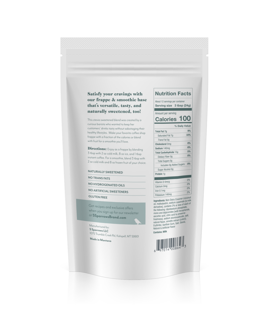 Want to enjoy your favorite coffee shop frappe with a fraction of the calories?  Our sugar free frappe powder is the perfect guilt-free treat that won’t derail your health.  Blend our sugar free frappe powder with ice, milk and coffee (or better yet, espresso powder) for a wicked good summertime snack.  Substitute coffee with fruit for a healthy smoothie young and old alike will love.
